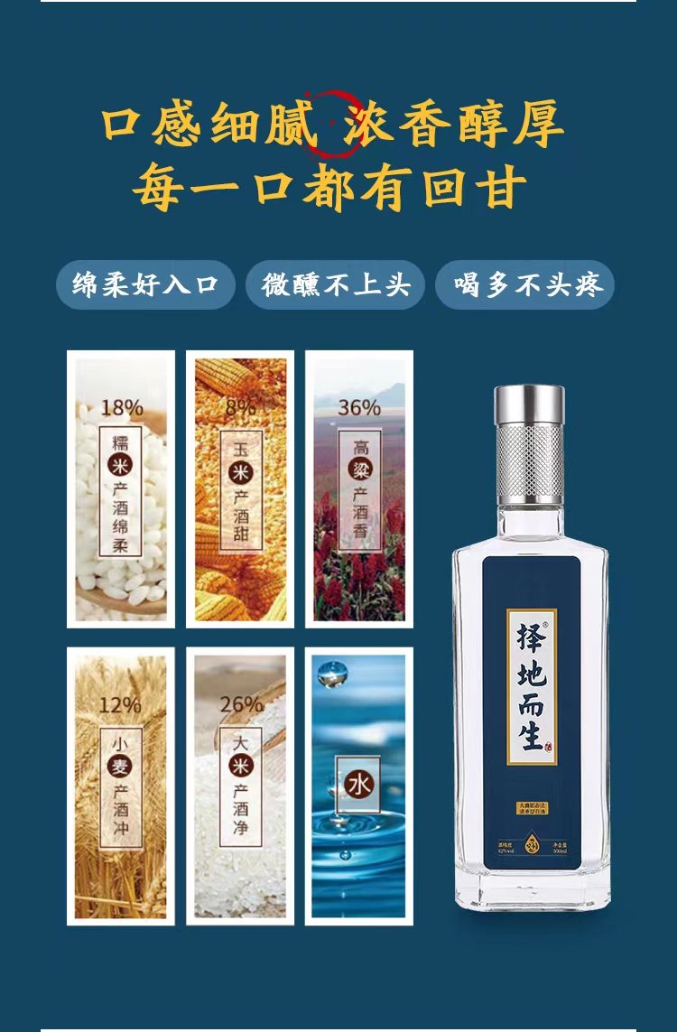 1、择地而生粮食白酒,决不添加任何香精香料和酒精