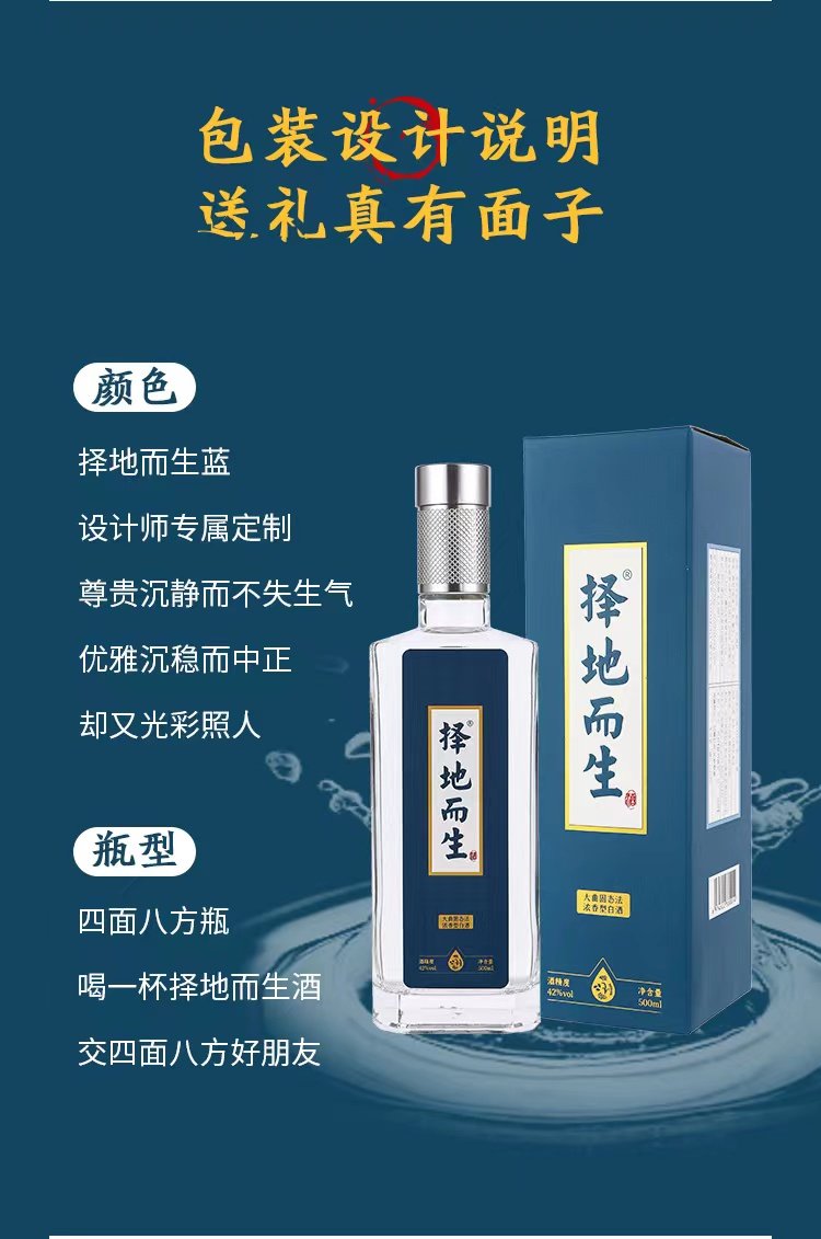 瓶型:四面八方瓶,取义:喝一杯择地而生酒,交四面八方好朋友。